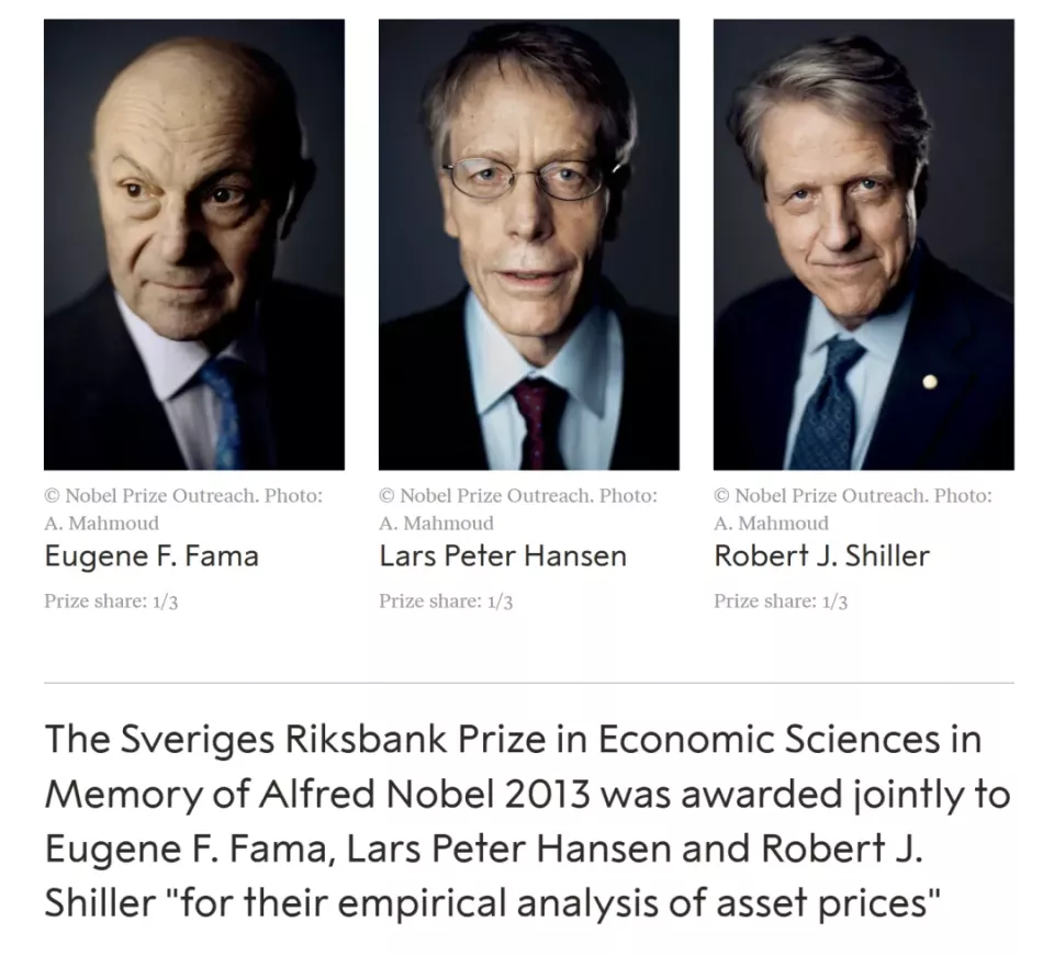 为表彰对“资产价格的经验主义分析”做出贡献的学者,2013年瑞典皇家科学院将该奖项颁发给了三位美国经济学家,尤金.法马(Eugene F. Fama)、拉尔斯.汉森(Lars Peter Hansen)以及罗伯特.席勒(Robert J. Shiller)。