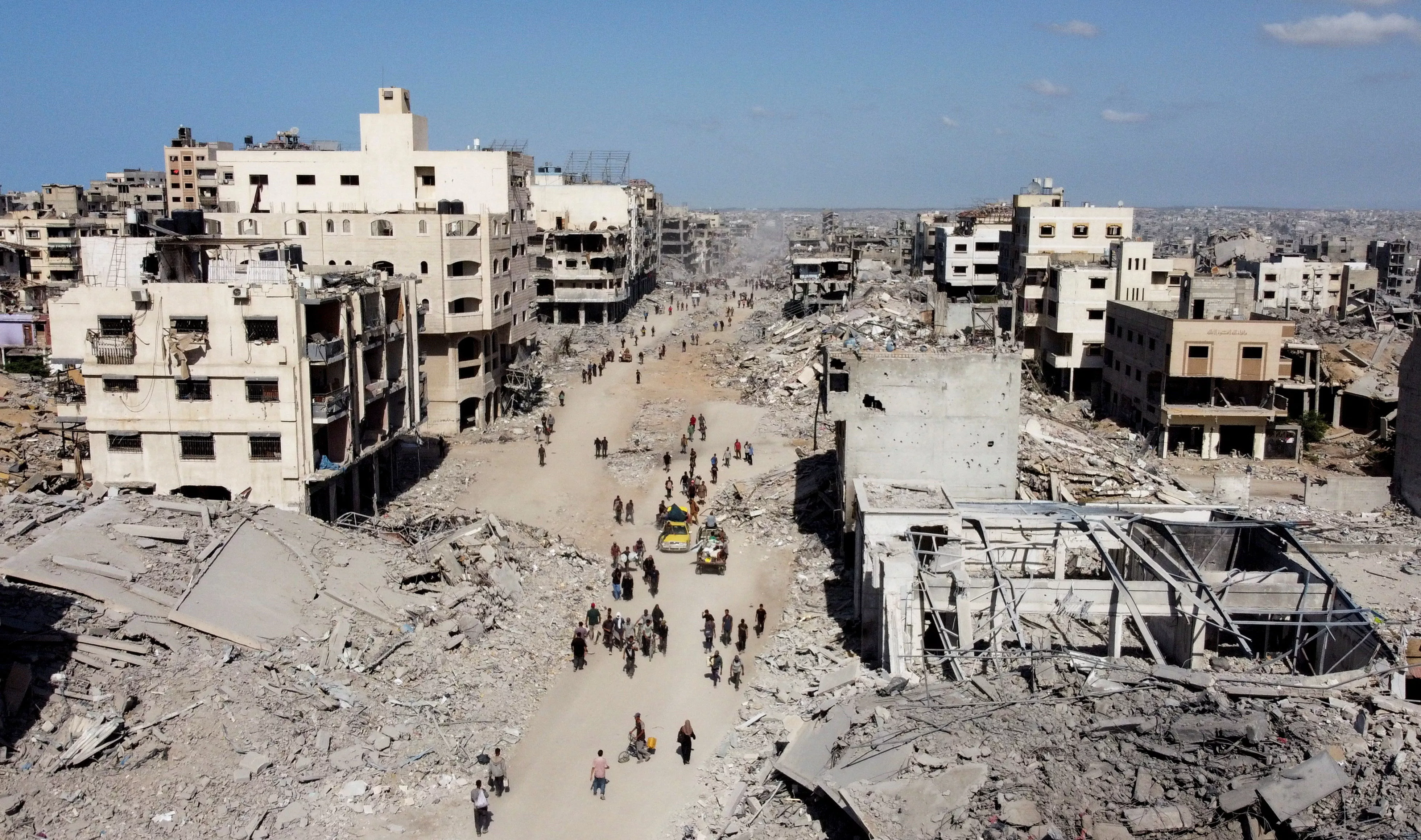▲ 以军撤出后的空拍画面可见巴勒斯坦人走过废墟。