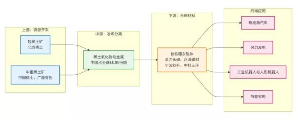 中国是全球唯一拥有完整稀土产业链的国家,构建了覆盖“上游开采-中游冶炼-下游应用”的闭环体系。