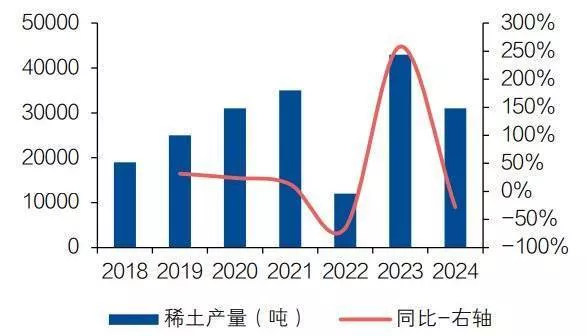 受此影响,2024年,缅甸稀土产量约3.1万吨,同比下滑27.91%。