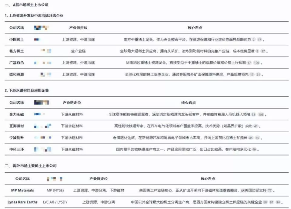 这里我整理了稀土产业链上游资源开采、中游冶炼、下游永磁材料生产的头部公司清单,由AlphaEngine FinGPT梳理。