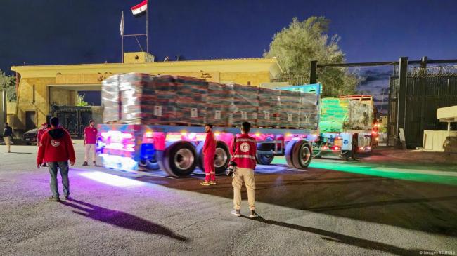10月12日,满载救援物资的卡车正通过埃及与加沙地带之间的边境口岸
