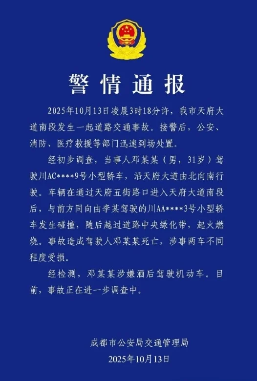 经初步调查,当事人邓某某(男,31岁)驾驶川AC****9号小型轿车,沿天府大道由北向南行驶。车辆在通过天府五街路口进入天府大道南段后,与前方同向由李某驾驶的川AA****3号小型轿车发生碰撞,随后越过道路中央绿化带,起火燃烧。事故造成驾驶人邓某某死亡,涉事两车不同程度受损。