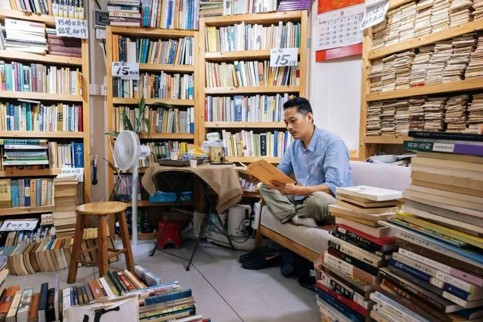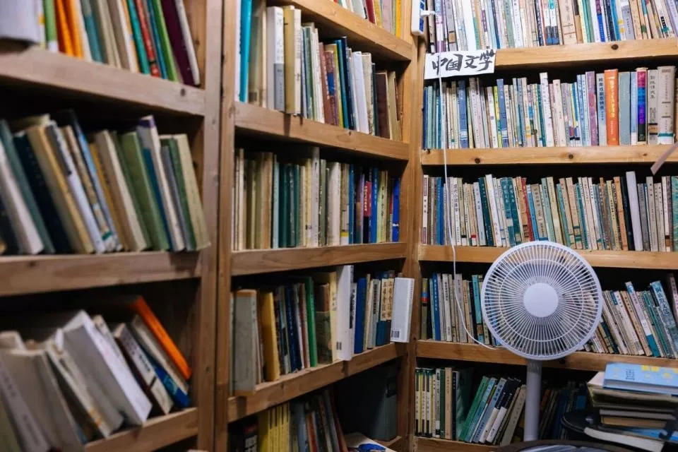 位于广州海珠区的鹭江书店,只卖二手书,没有咖啡、没有文创,狭小的空间里,只有堆满的书、三四台给书与人共用的电风扇、几张简易座椅,和一方小小的茶台。