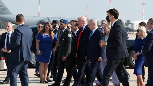 美国总统川普的空军一号周一上午在特拉维夫降落。特拉维夫本古里安机场为他铺设了红地毯。以色列总理内塔尼亚胡与总统赫尔佐格在机场迎接。