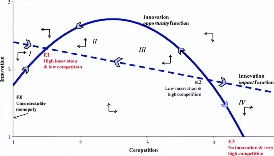 2005年,他们更进一步,提出了“倒U 型曲线”来解释竞争和创新的关系,完成了对阿罗和熊彼特观点的统一概括。