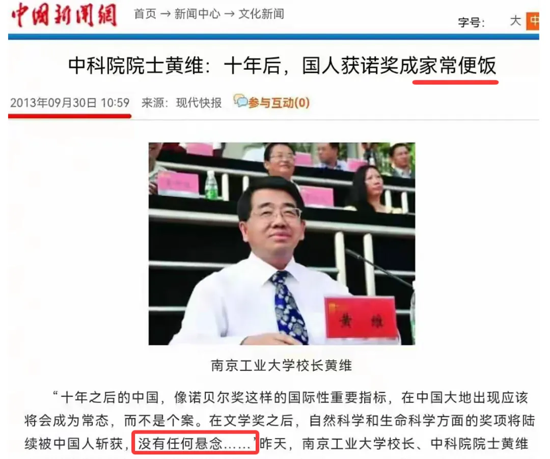 因为这位黄维大咖,曾经在十年前表示——十年后,诺贝尔奖在中国大地出现的频率将会成为常态,诺贝尔奖在中国将会成为家常便饭,这是没有任何悬念的事情……