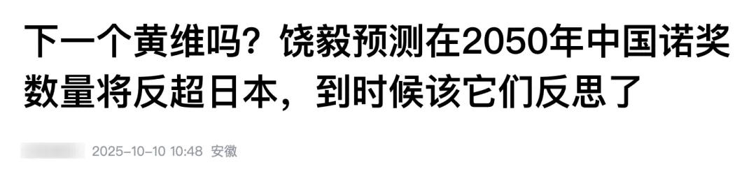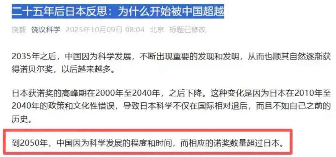 饶毅教授预言,25年后,中国的诺贝尔奖得数将会超过日本,因为日本目前已经出现了政策和文化性错误。