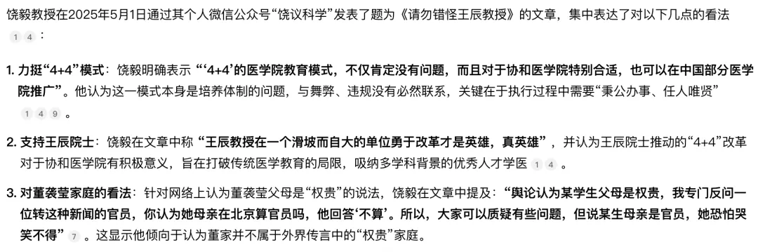 那就是在董小姐事件闹得沸沸扬扬的时候,饶毅教授则站出来表示,4+4模式没有问题,董小姐家不是权贵,大家不要错怪王辰教授: