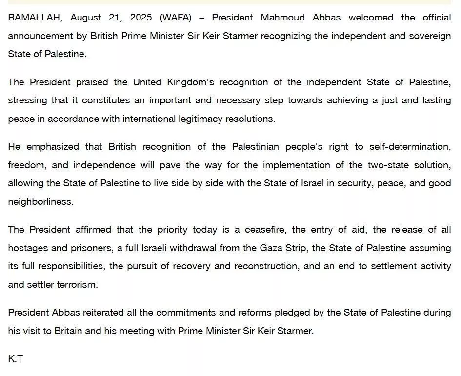 9月21日,巴勒斯坦通讯社“WAFA”报道,总统马哈茂德·阿巴斯对英国首相基尔·斯塔默正式宣布承认巴勒斯坦独立主权国表示欢迎。该报道表明了当下的一些首要任务,但并未提及赔偿问题。