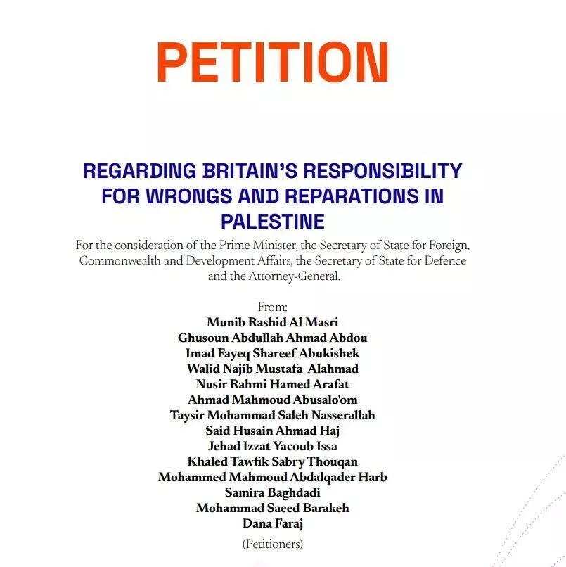 这份超过400页的请愿书引用了《国家对国际不法行为的责任条款草案》(Draft Articles on Responsibility of States for Internationally Wrongful Acts, ILC 2001)、国际联盟《巴勒斯坦委任统治条约》(Mandate for Palestine, 1922)、《世界人权宣言》(Universal Declaration of Human Rights, 1948)等许多国际法条文,追溯英国的法律责任,请求英国政府承认历史违约并启动对补偿形式的调查与商议。