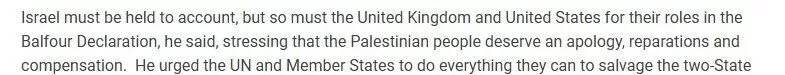 2023年9月21日,阿巴斯在联合国发言中曾强调,“将政治冲突转化为宗教冲突的后果,以色列必将承担全部责任……但英国和美国在《贝尔福宣言》(Balfour Declaration)中的角色同样应受问责,巴勒斯坦人民理应获得道歉、赔偿和补偿。” 但是阿巴斯未曾在这类赔偿要求后附上具体数额。