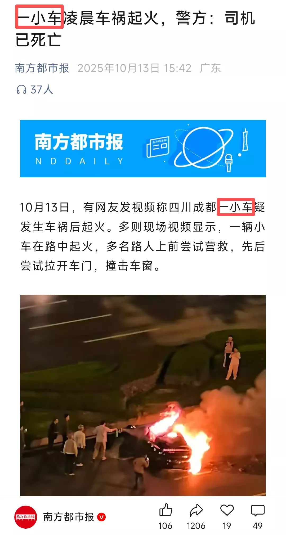 虽然现场照片及多源信息都已经确认,起火的车子就是小米SU7,甚至都已经精确到是SU7Ultra,但很多媒体在报道时,竟然不约而同地回避了涉事汽车的品牌。