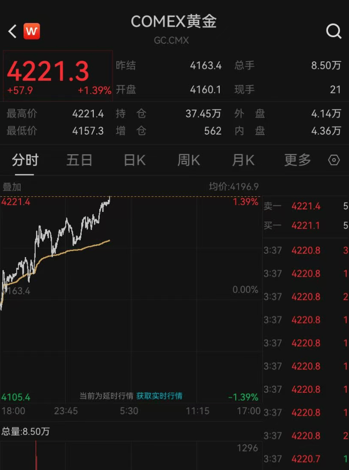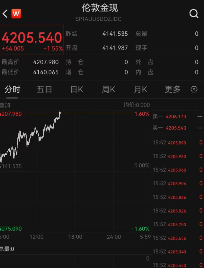 截至发稿,伦敦现货黄金突破4200美元关口,报4205.54美元/盎司,再创历史新高。