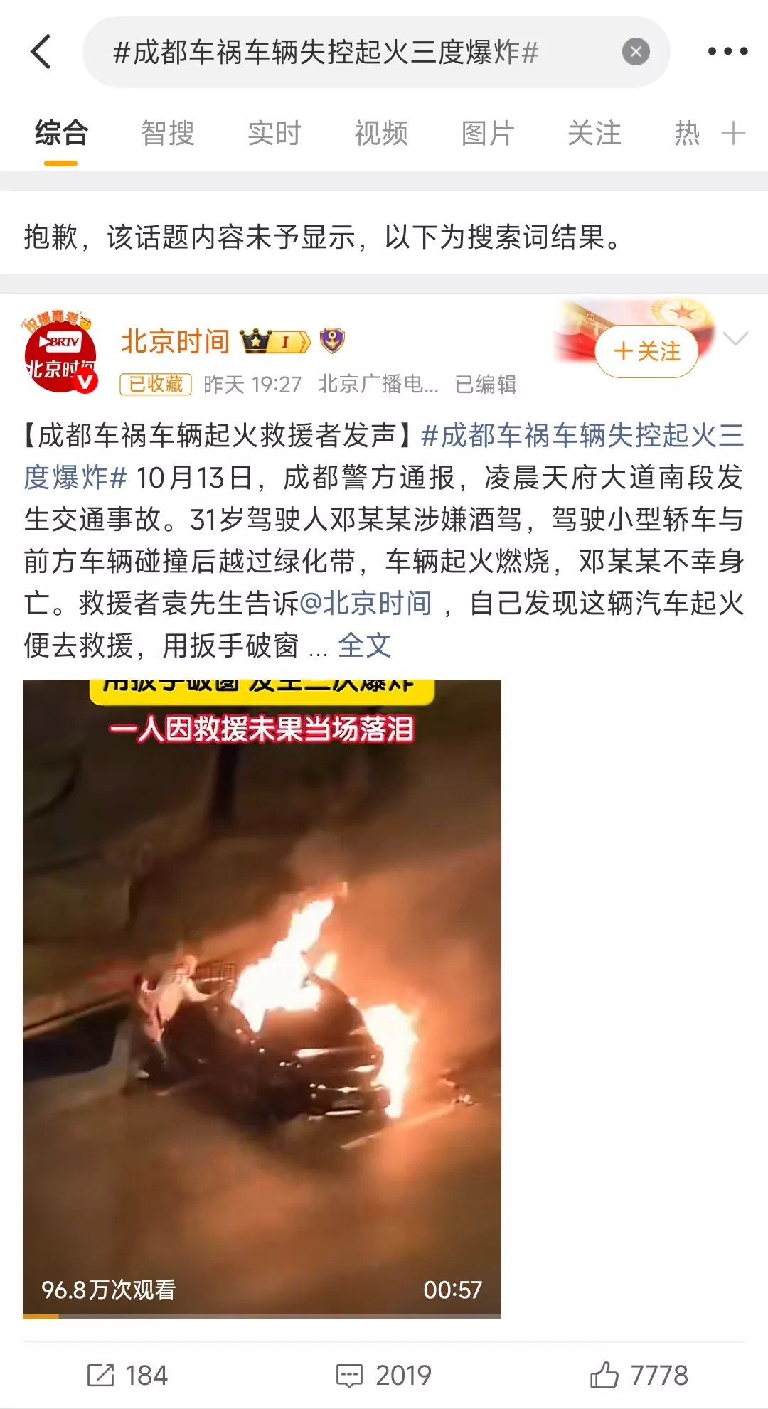 就比如,据官方警情通报可知,事件发生在2025年10月13日凌晨3时18分左右,地点是成都市天府大道南段,驾驶员邓某某(31岁)涉嫌酒驾,追尾前车后,撞击绿化带翻滚起火身亡。