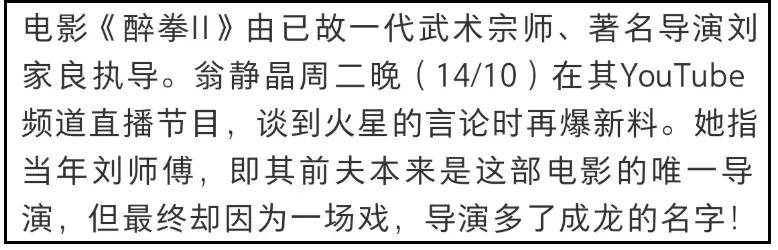 翁静晶表示很多事一直未说,如今听闻火星站出来了,那自己也跟着透露些关于《醉拳2》的内幕。她表示,前夫刘家良本是这部影片的唯一导演,但因为一场戏,成龙却成了联合导演。