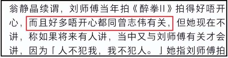 除炮轰成龙抢功外,翁静晶还透露了刘家良当年在片场的状态。她直言前夫拍这部影片很不开心,与他人发生了不少矛盾,片酬还被克扣,其中有一部分和曾志伟有关系,但自己现在不愿多说。