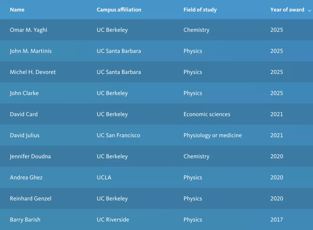 短短三天,加州大学系统(UC)就包揽了五项大奖!简直是“诺贝尔奖收割机”本机!伯克利、圣塔芭芭拉、圣地亚哥、洛杉矶(专题),全都榜上有名。