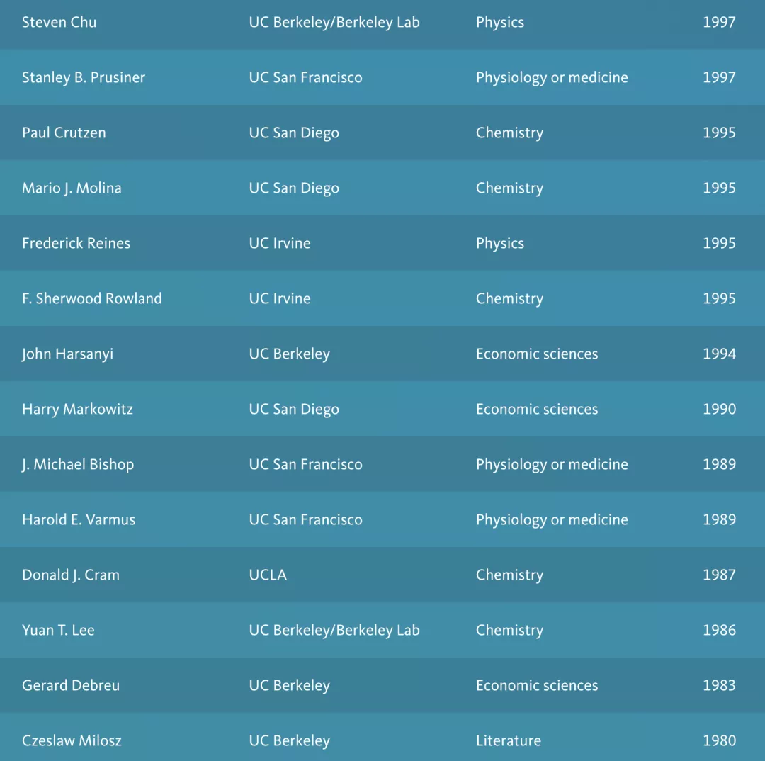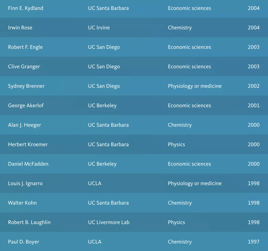 也因此,UC和诺贝尔奖的缘分早已密不可分,UC 系列的第一个诺贝尔奖出现在 1939 年,到现在——UC体系共拿下75项诺贝尔奖。光物理学奖就有23项。UCSF、UCLA、UCSD 都在医学、经济、化学等领域拿过大奖。