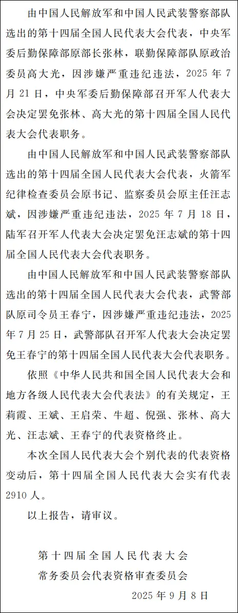 来源:倍可亲(backchina.com)据中国人大网发布的《中华人(专题)民共和国全国人民代表大会常务委员会公报2025年第五号》披露,张林、高大光、汪志斌、王春宁四名军队代表被罢免第十四届全国人民代表大会代表职务的原因是“涉嫌严重违纪违法”。