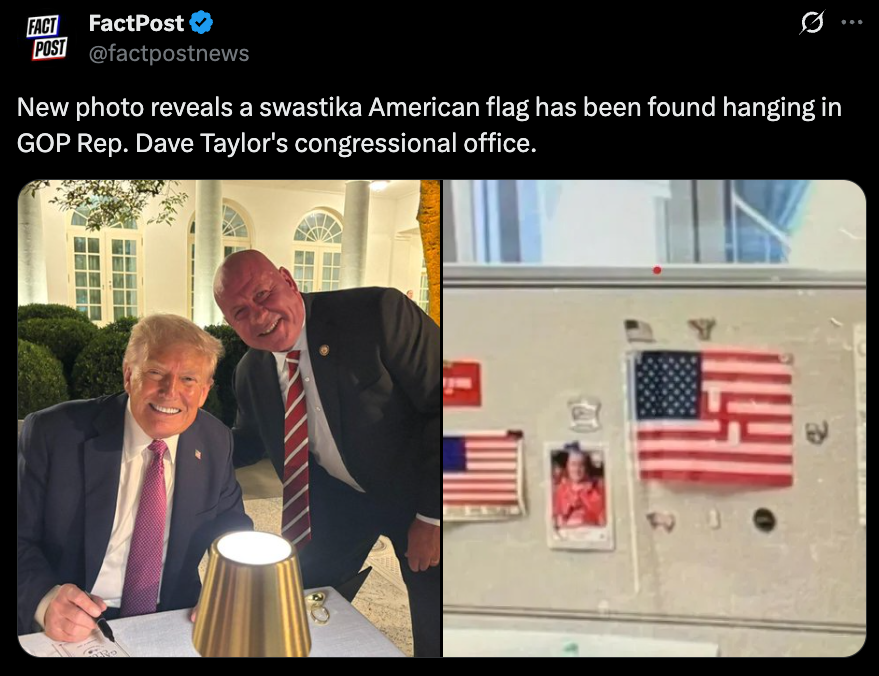 来源:倍可亲(backchina.com)据美国“政治”新闻网当地时间10月15日报道,美国共和党籍众议员戴夫·泰勒的办公室内被拍到挂着一面包含纳粹标志的美国国旗,有关照片在互联网上广泛传播。美国国会警察正对此事展开调查。