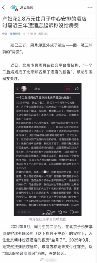 孩子已满三岁,北京的周月女士(化名)却因一笔三年前的“月子房费”成为被告。她告诉@津云新闻 记者,2022年9月,她在支付2.8万元服务费后,通过月子中心入住某亲子酒店休养。然而今年9月,该酒店以“未支付住宿费”为由起诉周月,追讨1.9万余元。