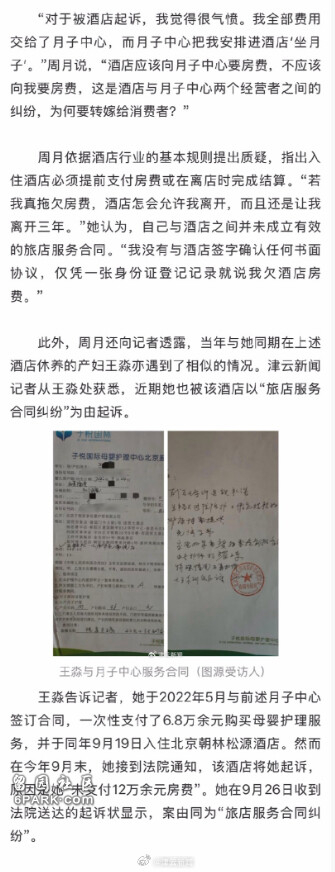 “费用早已全额交给月子中心,与酒店并无直接合同,为何经营者之间的纠纷要转嫁给消费者?”周月表示无法理解。她回忆,入住期间全程由月子中心工作人员代办手续,未与酒店前台直接接触,甚至连房费标准都未知情。与周月经历相似,同期入住的王淼(化名)在支付6.8万元服务费后,也被该酒店起诉追讨12万余元“房费”。