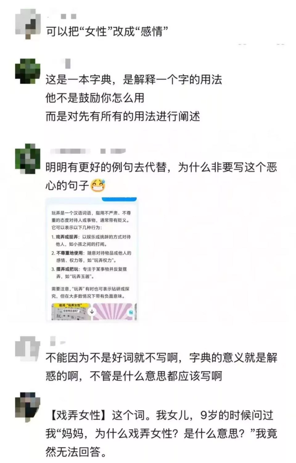 “我家是个小男孩,当他问我‘玩’字为什么要组‘玩女性’这个词时,我一时语塞,不敢相信《新华字典》里会有这样的内容。”张女士向长江云新闻记者强调,《新华字典》作为学生启蒙的权威工具书,其中的每个例句都可能对正处于价值观形成关键期的未成年人产生潜移默化的影响。她进一步质疑:“在解释‘玩’字的‘戏弄’义时,明明有‘玩弄人心’这类中性词可选,为什么偏偏要使用一个明显物化并歧视女性的短语作为示例?这实在不妥。”