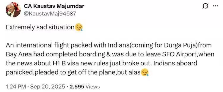“极其悲伤的情况......一架载有来自湾区的印度人的国际航班已经完成登机,原定离开旧金山国际机场。当有关H-1B签证新规定的消息刚刚传出时,机上的印度人惊慌失措,恳求下飞机。”特许会计师考斯塔夫·马朱姆达尔 (Kaustav Majumdar) 在推特上描述了当天飞机上的情况。