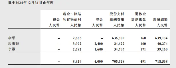 雷达财经查阅发现,“6.8亿港元”的出处来自于理想汽车2024年年报,换算成人民币(专题)为6.39亿元,包含266.5万元薪金津贴、16 万元退休金计划供款以及6.36亿元股份支付薪酬。