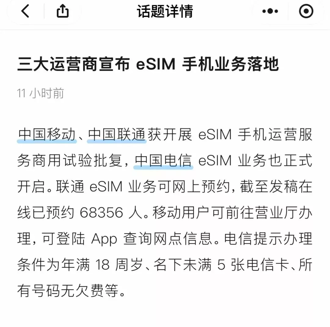 之前的现状是,eSIM在中国除了Apple Watch蜂窝版有小部分支持,三大运营商都是消极态度(反正市场需求小,我干嘛吃力不讨好去推eSIM)。