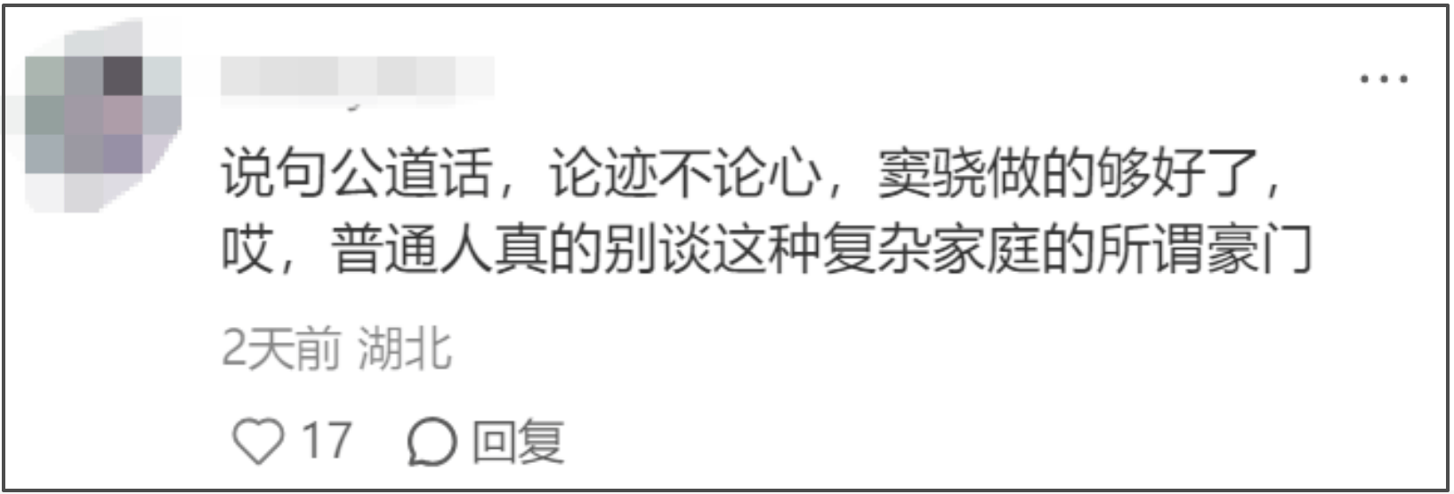 还有网友觉得赌王三房太抠门了,对儿媳妇和女婿都利用完就抛弃,窦骁已经做的很好,婚礼都是他全包,结果婚后天天防着他,普通人对关系利益复杂的豪门还是敬而远之吧。