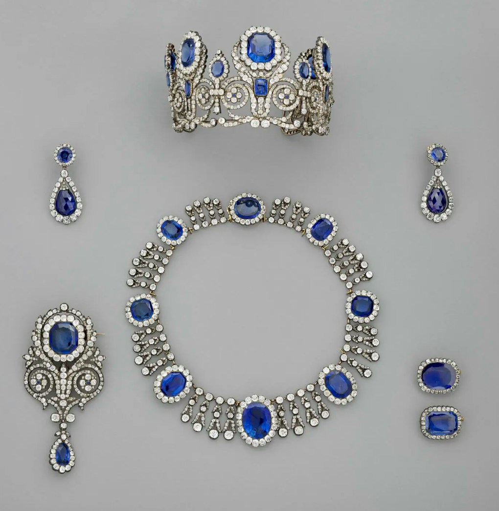 图为遭劫的阿波罗长廊中展品之一,玛丽-艾米莉王后的蓝宝石和鑽石首饰。(罗浮宫)