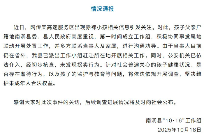 18日,南涧县官方回应“高速服务区现赤裸小孩”事件,称对事件高度重视,已成立工作组,针对公众关注的孩子健康状况、是否存在虐待、监护与教育问题,将依法依规深入调查,并及时公布后续进展。