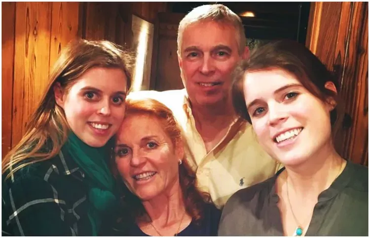 安德鲁王子(右二)与前妻莎拉(左二)、他们的一对女儿碧翠丝(左一)、尤金妮全家福。IG