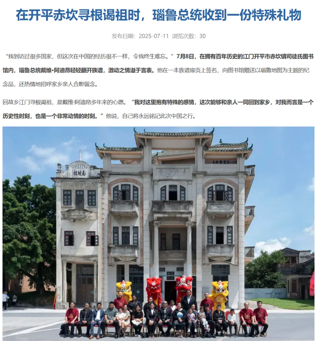就在他连任的次日,老家广东开平赤坎镇中股村敲锣打鼓为老乡庆祝。今年7月,戴维•阿迪昂曾率27人回到外曾祖父家乡开平寻根谒祖。