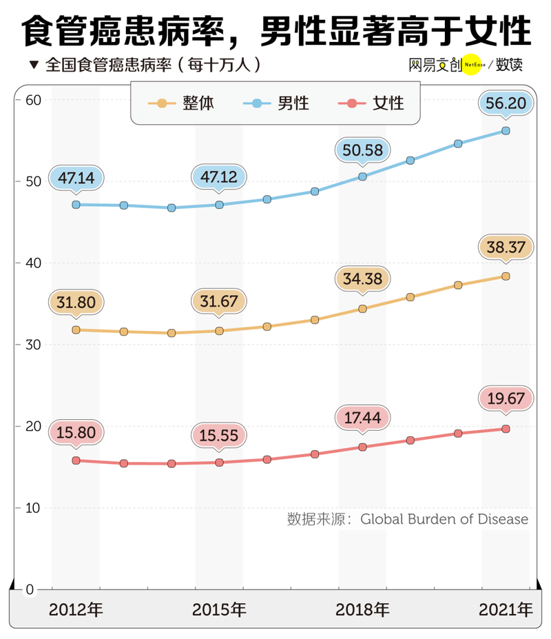 从性别来看,男性食管癌患病率要远高于女性。全球疾病负担的调查显示,2021 年,中国食管癌患病率是每十万人 38.37 例,男性是每十万人 56.20 例,接近女性患病率的三倍 [1]。