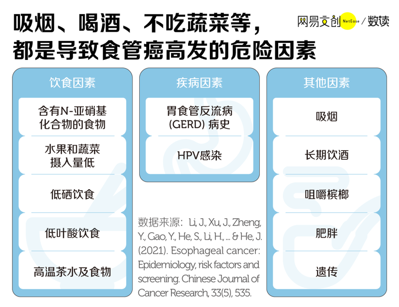 《中国癌症研究杂志》发布的一项荟萃分析总结,吸烟、喝酒、嚼槟榔、营养摄入不足等都是可能导致食管癌高发的主要危险因素 [6]。