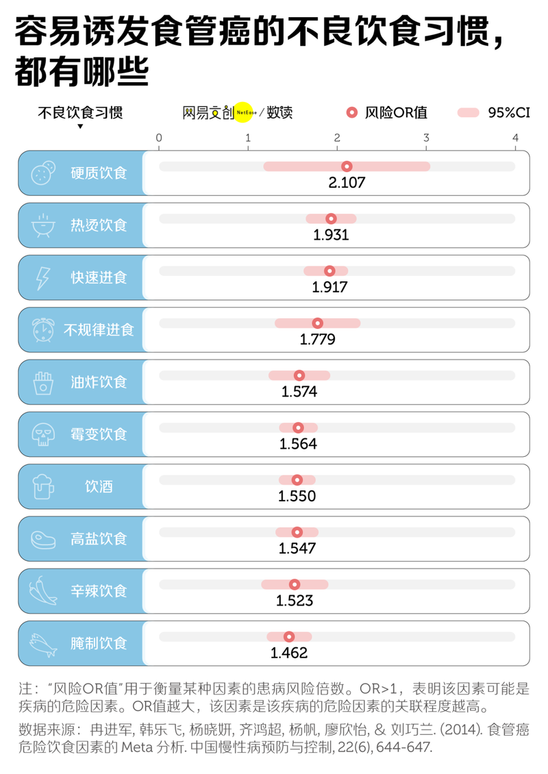 四川大学华西医学中心曾分析了十种不良饮食习惯与食管癌发病风险之间的关系,结果表明,拥有“热烫饮食”和“辛辣饮食”习惯的人群患食管癌的风险分别是其他人的 1.9 倍和 1.5 倍 [8]。