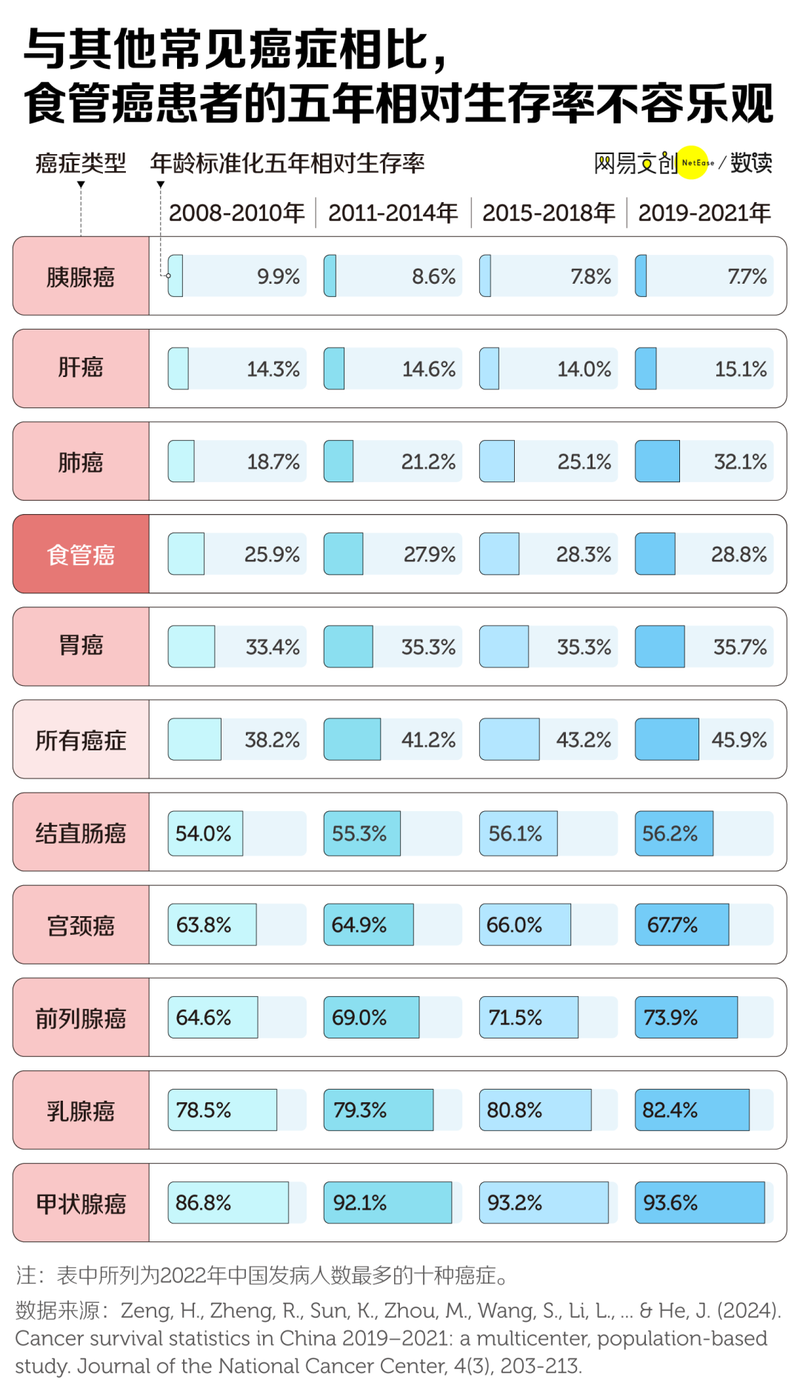 根据国家癌症中心 2024 年发布的统计结果,在 2019-2021 统计周期内,全国食管癌的年龄标准化五年生存率仅为 28.8%,远低过胃癌与结直肠癌,也低于所有癌症的平均水平(45.9%)[14]。