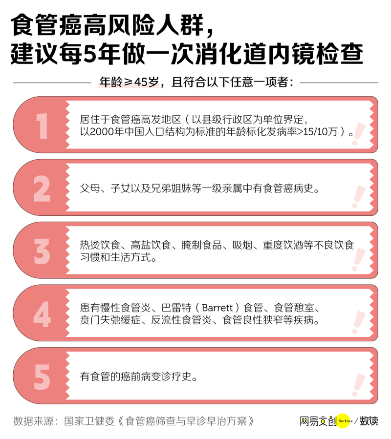 国家卫健委发布的《食管癌筛查与早诊早治方案》便建议,年龄大于等于 45 岁符合特定标准的高风险人群,例如居住在食管癌高发地区或一级亲属中有食管癌病史,可以每五年做一次消化道内镜检查, [15]。