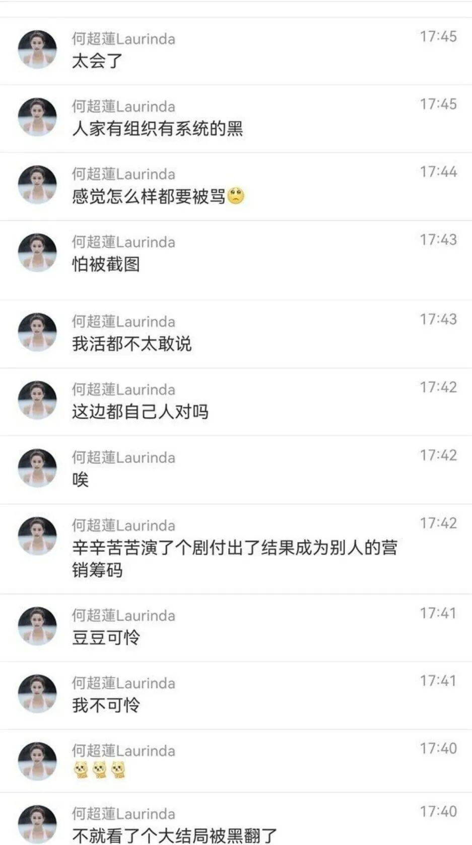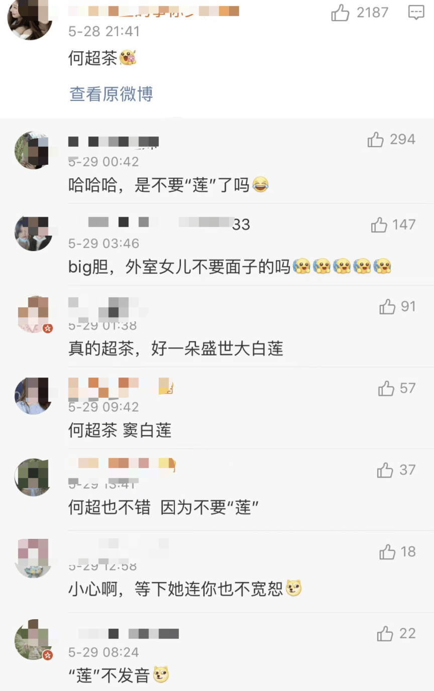 说什么“没人抢你家驸马”、“别搞得像女演员倒贴一样”都算言辞温和的了,多得是网友在人身攻击她,骂她“何超茶”、“不要莲”、“外室女儿不要面子的吗”……