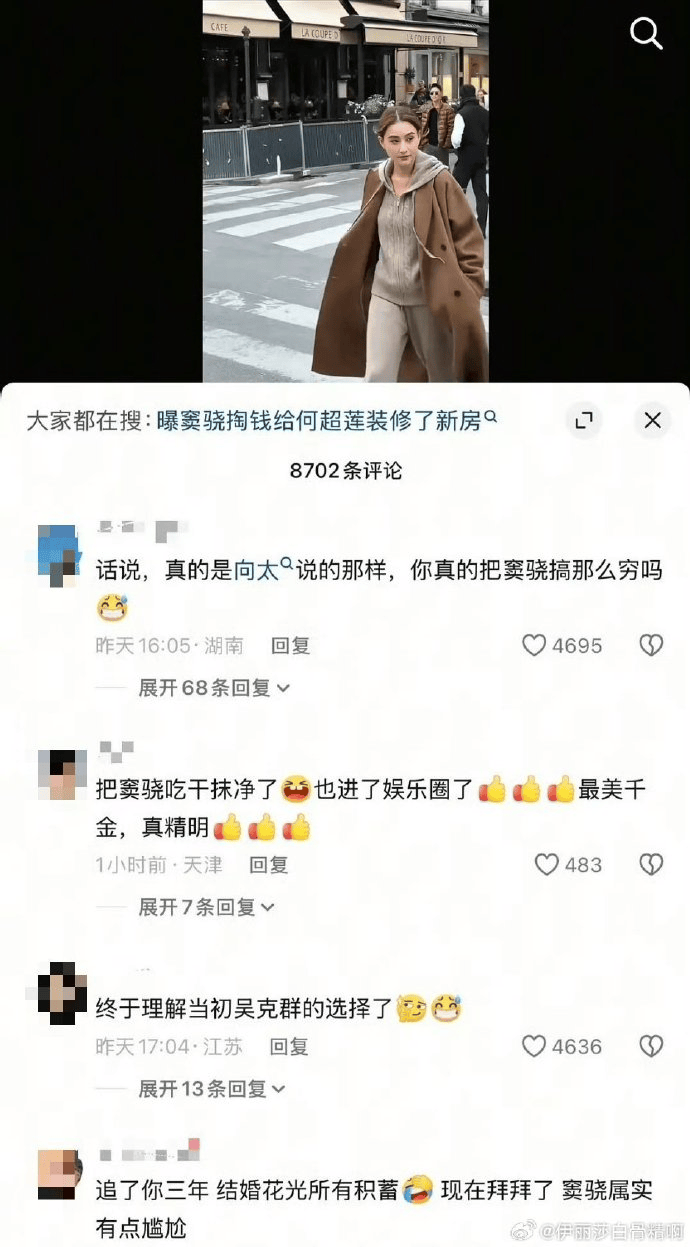 这次被传闹离婚也是,不少人跑来何超莲评论区为窦骁鸣不平,说何超莲太精明了,把窦骁吃干抹净还顺势进入娱乐圈,“窦骁亏惨了,钱花光了事业也耽误了”、“还窦骁血汗钱”、“吴克群人间清醒”。