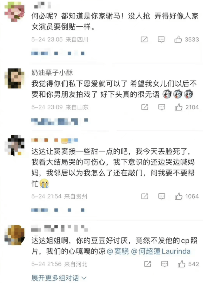 剧宣相关的微博底下,何超莲会抢沙发,秒发“第一个”评论。剧播完之后,她还在粉丝群有过一波迷惑发言,意思是是这部剧全靠窦骁撑起来,不舍得他被欺负,明明用心帮她对戏让她演好结果却被黑。