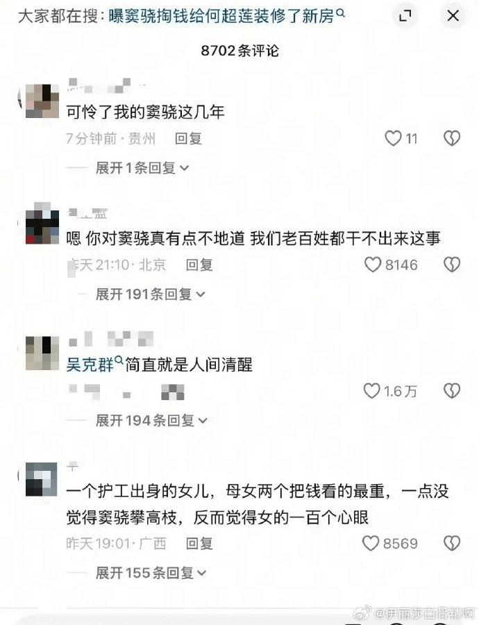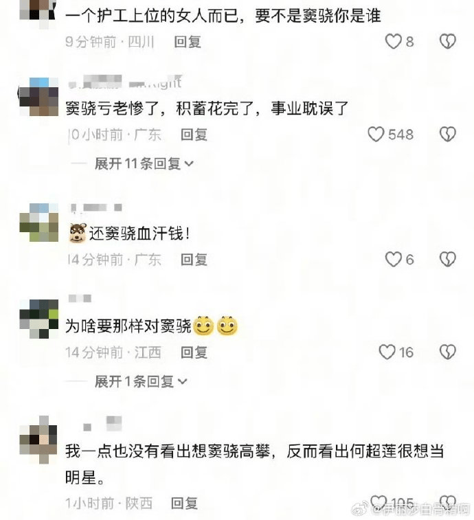 “没看出来窦骁想高攀,反而看出来何超莲很想当明星”、“一个护工上位的女人而已,要不是窦骁你是谁”、“母女俩把钱看得太重,女的一百个心眼”、“你对窦骁真不地道,我们老百姓可干不出来这事”……