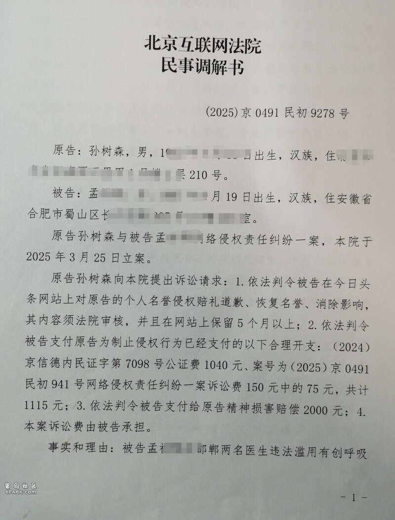 2025年6月,经北京互联网法院调解,孟某在其网络账号上向孙树森公开赔礼道歉,“道歉内容保留5个月”,此外还赔偿损失3115元。