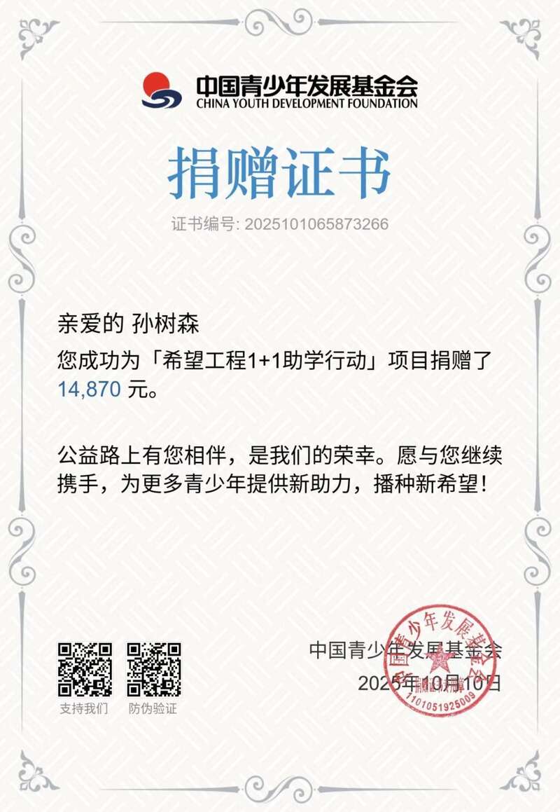 10月中旬,孙树森将上述两起诉讼获得的赔偿款1.4万余元,捐赠给了中国青少年发展基金会“希望工程”。
