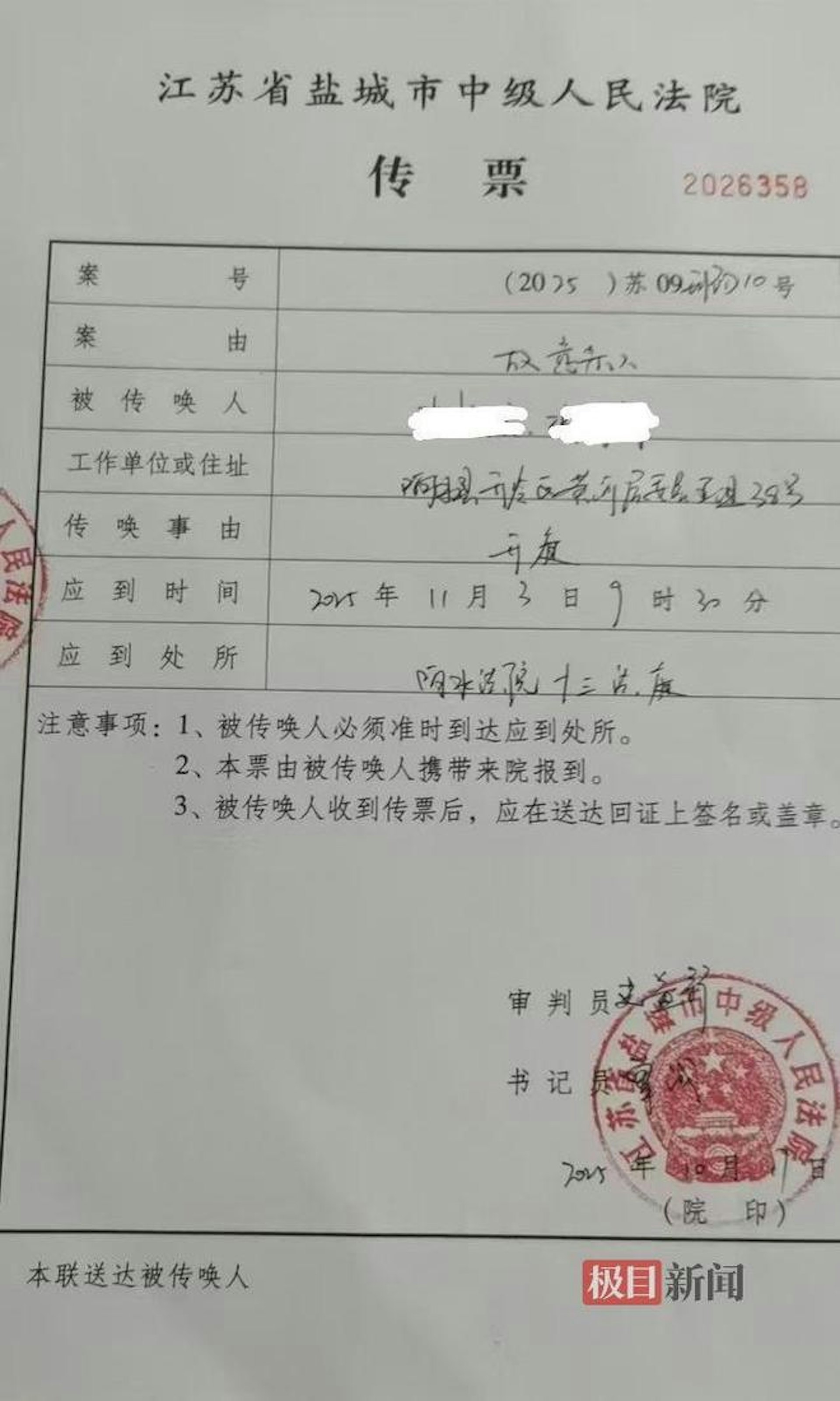 盐城市中级人民法院已发出开庭传票。(极目新闻)