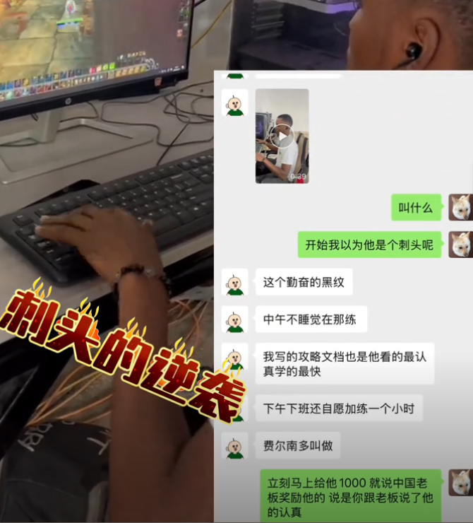 在这般“严肃又活泼”的企业文化下,非洲员工总体操作水平上的进步是有目共睹的,不仅中文UI界面了熟于心,魔兽也从简单的力工打成了刷稀有道具的心法高手,甚至三角洲有时还能顶着高Ping跑刀成功,带着千万收益撤离。