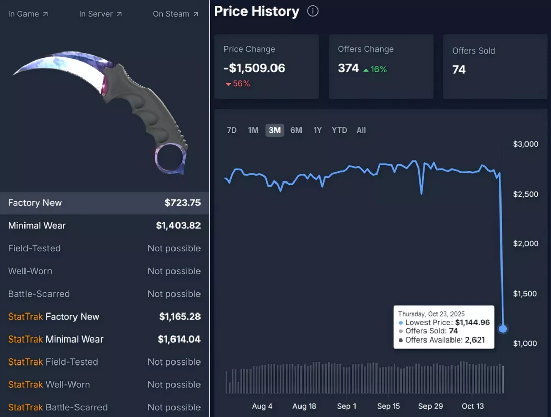比如先前市场上较贵的武器饰品之一爪刀多普勒(Karambit Doppler),据CSGOSKINS平台显示,其价格从2700多美元骤跌到了1100多美元。